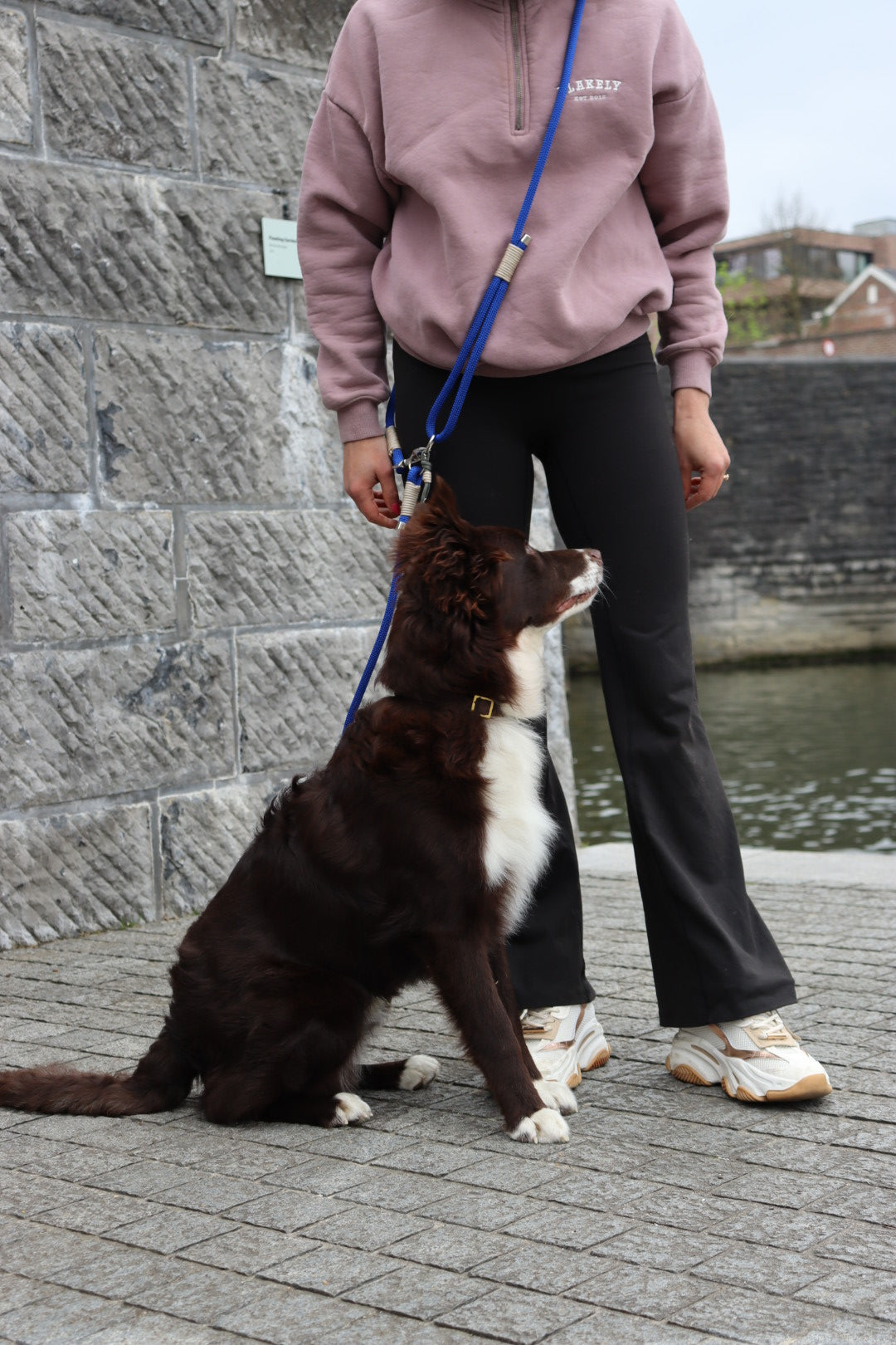 Onze Blue Chrome Funk 2-in-1 hondenleiband is de perfecte combinatie van stijl en functionaliteit. Draag hem comfortabel om je lichaam voor een handsfree ervaring tijdens wandelingen of hardlopen. Wil je het traditioneel gebruiken? Klik het systeem eenvoudig af en gebruik de riem met de hand.